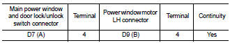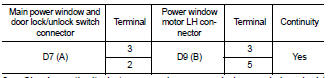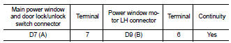 2. Check continuity between main power window and door lock/ unlock switch connector (A) and power window motor LH connector (B).