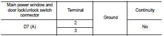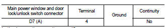 4. Check continuity between main power window and door lock/unlock switch connector (A) and ground.