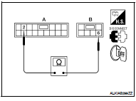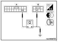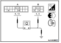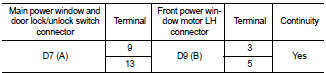 2. Check continuity between main power window and door lock/ unlock switch connector (A) and front power window motor LH connector (B).
