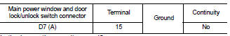 4. Check continuity between main power window and door lock/unlock switch connector (A) and ground.