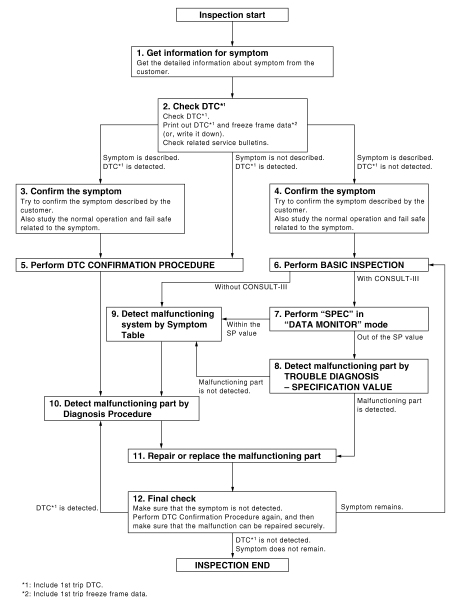 - Record DTC and freeze frame data. (Print them out with CONSULT-III or GST.) - Erase DTC. (Refer to EC-641, "Diagnosis Description".) - Study the relationship between the cause detected by DTC and the symptom described by the customer.