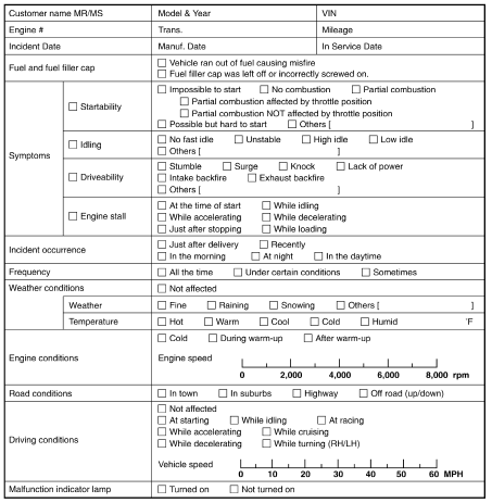 Get the detailed information from the customer about the symptom (the condition and the environment when the incident/malfunction occurred) using the “Diagnostic Work Sheet”. (Refer to EC-558, "Diagnostic Work Sheet".) >> GO TO 2.