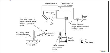 The vapor in the EVAP canister is purged by the air through the purge line to the intake manifold when the engine is operating. EVAP canister purge volume control solenoid valve is controlled by ECM. When the engine operates, the flow rate of vapor controlled by EVAP canister purge volume control solenoid valve is proportionally regulated as the air flow increases.