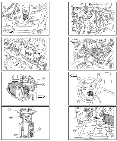 10. Fuel level sensor unit and fuel pump harness connector (This illustration is view with rear seat cushion and inspection hole cover removed.)