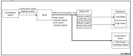 With the lighting switch in the 2ND position and placed in HIGH position, the BCM receives input requesting the headlamp high beams to illuminate. The flash to pass feature can be used any time and also sends a signal to the BCM. This input is communicated to the IPDM E/R across the CAN communication lines. The CPU of the combination meter controls the ON/OFF status off the HIGH BEAM indicator. The CPU of the IPDM E/R controls the headlamp high relay coil which supplies power to the high beam headlamps.
