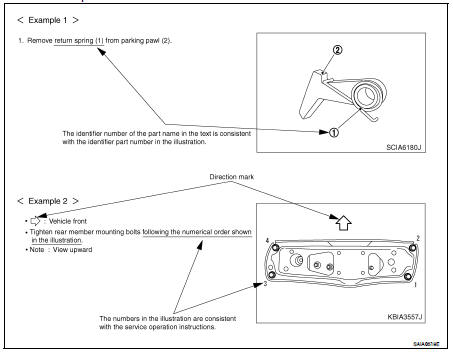 The following sample explains the relationship between the part description in an illustration, the part name in the text and the service procedures.