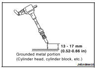 11. Fix ignition coil using a rope etc. with gap of 13 - 17 mm (0.52 - 0.66 in) between the edge of the spark plug and grounded metal portion as shown in the figure.