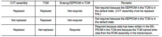 CAUTION: • Check if new data (Unit ID) are entered correctly after replacing CVT assembly and erasing data in TCM. (Connect CONSULT-III, and then turn ignition switch OFF.) • When replacing CVT assembly or TCM, refer to the pattern table below and erase the EEPROM in the TCM if necessary.