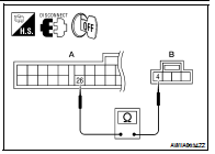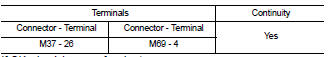 3. Check continuity between front air control connector M37 (A) terminal 26 and intake sensor harness connector M69 (B) terminal 4.