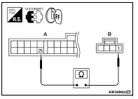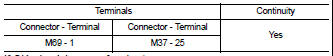 3. Check continuity between front air control connector M37 (A) terminal 25 and intake sensor harness connector M69 (B) terminal 1.