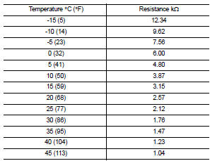 After disconnecting intake sensor harness connector, measure resistance between terminals 1 and 2 at sensor harness side, using the table below.