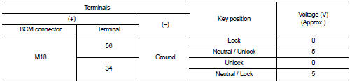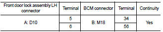 2. Check continuity between front door lock assembly LH (key cylinder switch) connector and BCM connector M18.