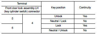 NO >> Replace front door lock assembly LH (key cylinder switch). Refer to DLK-451, "FRONT DOOR LOCK : Removal and Installation".