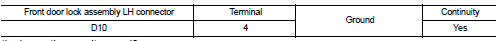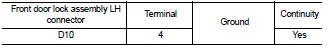 Check continuity between front door lock assembly LH connector and ground.