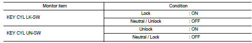 Check KEY CYL UN-SW, KEY CYL UN-SW in “DATA MONITOR” mode for “POWER DOOR LOCK SYSTEM” with CONSULT-III. Refer to DLK-231, "Work Flow".