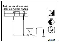 2. Check voltage between main power window and door lock/ unlock switch connector and ground.