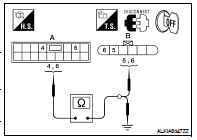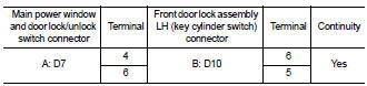 3. Check continuity between main power window and door lock/ unlock switch connector and front door lock assembly LH (key cylinder switch) connector.
