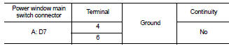4. Check continuity between main power window and door lock/ unlock switch connector and ground.