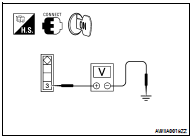 Check voltage between mode door motor connector M127 terminal 3 and ground, between air mix door motor connector M130 terminal 3 and ground, and between intake door motor connector M126 terminal 3 and ground.