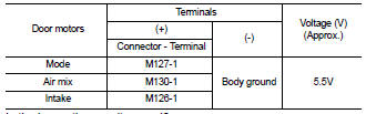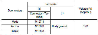 Check voltage between mode door motor connector M127 terminal 1 and ground, between air mix door motor connector M130 terminal 1 and ground, and between intake door motor connector M126 terminal 1 and ground.
