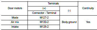 3. Check continuity between mode door motor connector M127 terminal 2 and ground, between air mix door motor connector M130 terminal 2 and ground, and between intake door motor connector M126 terminal 2 and ground.