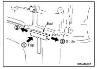 b. Slide (2) the Tool by tapping (1) its side with a hammer to remove the lower oil pan from the upper oil pan.