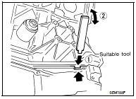 b. Insert an appropriate size tool into the notch (1) of the upper oil pan as shown.