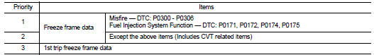 Only one set of freeze frame data (either 1st trip freeze frame data or freeze frame data) can be stored in the ECM. 1st trip freeze frame data is stored in the ECM memory along with the 1st trip DTC. There is no priority for 1st trip freeze frame data, and it is updated each time a different 1st trip DTC is detected. However, once freeze frame data (2nd trip detection/MIL on) is stored in the ECM memory, 1st trip freeze frame data is no longer stored. Remember, only one set of freeze frame data can be stored in the ECM. The ECM has the following priorities to update the data.