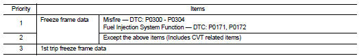 For example, the EGR malfunction (Priority: 2) was detected and the freeze frame data was stored in the 2nd trip. After that when the misfire (Priority: 1) is detected in another trip, the freeze frame data will be updated from the EGR malfunction to the misfire. The 1st trip freeze frame data is updated each time a different malfunction is detected. There is no priority for 1st trip freeze frame data. However, once freeze frame data is stored in the ECM memory, 1st trip freeze data is no longer stored (because only one freeze frame data or 1st trip freeze frame data can be stored in the ECM). If freeze frame data is stored in the ECM memory and freeze frame data with the same priority occurs later, the first (original) freeze frame data remains unchanged in the ECM memory.