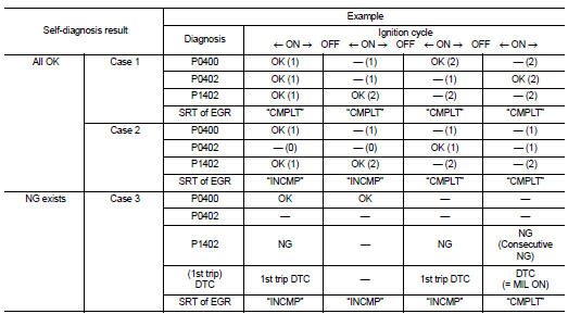 SRT is set as “CMPLT” after self-diagnosis has been performed one or more times. Completion of SRT is done regardless of whether the result is OK or NG. The set timing is different between OK and NG results and is shown in the table below.