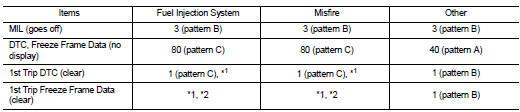 *4: The DTC and the freeze frame data will not be displayed any longer after vehicle is driven 40 times (pattern A) without the same malfunction.