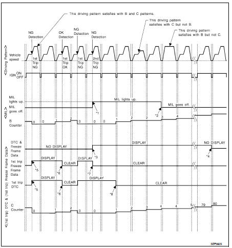 *4: The DTC and the freeze frame data will not be displayed any longer after vehicle is driven 80 times (pattern C) without the same malfunction. (The DTC and the freeze frame data still remain in ECM.) *5: When a malfunction is detected for the first time, the 1st trip DTC and the 1st trip freeze frame data will be stored in ECM.