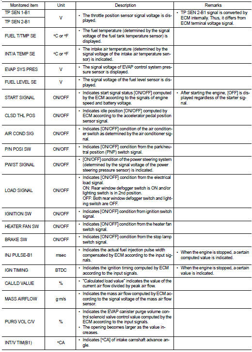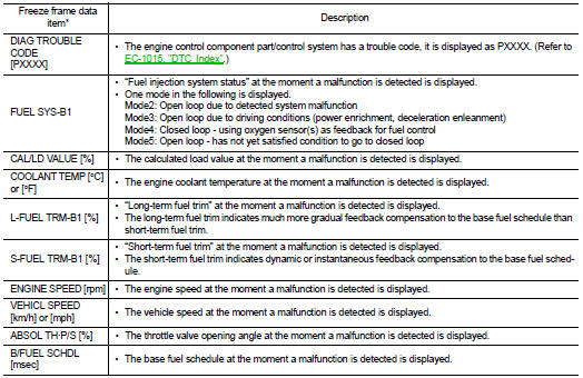 The ECM records the driving conditions such as fuel system status, calculated load value, engine coolant temperature, short term fuel trim, long term fuel trim, engine speed, vehicle speed, absolute throttle position, base fuel schedule and intake air temperature at the moment a malfunction is detected.