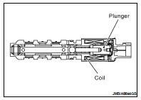 2. Provide 12V DC between intake valve timing control solenoid valve terminals 1 and 2, and then interrupt it. Make sure that the plunger moves as shown in the figure.