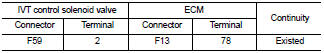 3. Check the continuity between intake valve timing control solenoid valve harness connector and ECM harness connector.