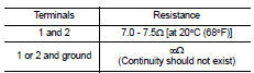 3. Check resistance between intake valve timing control solenoid valve terminals as follows.