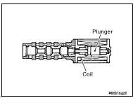 2. Provide 12 V DC between intake valve timing control solenoid valve terminals 1 and 2, and then interrupt it. Check that the plunger moves as shown in the figure.
