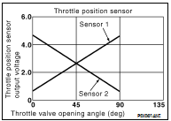 The throttle position sensor has two sensors. These sensors are a kind of potentiometers which transform the throttle valve position into output voltage, and emit the voltage signal to the ECM. In addition, these sensors detect the opening and closing speed of the throttle valve and feed the voltage signals to the ECM. The ECM judges the current opening angle of the throttle valve from these signals and the ECM controls the throttle control motor to make the throttle valve opening angle properly in response to driving condition.