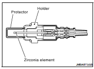 Therefore, the A/F sensor 1 is able to indicate air fuel ratio by this electrode layer of current. In addition, a heater is integrated in the sensor to ensure the required operating temperature of approximately 800°C (1,472°F).