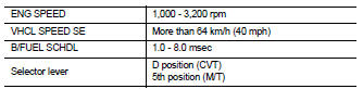 3. Shift the selector lever to the D position (CVT) or 5th position (M/T), then release the accelerator pedal fully until the vehicle speed decreases to 50 km/h (31 MPH).