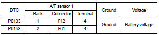 4. Check the voltage between A/F sensor 1 harness connector and ground.