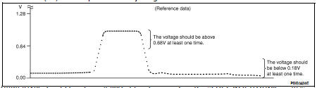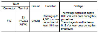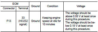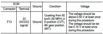 The heated oxygen sensor 2 has a much longer switching time between rich and lean than the air fuel ratio (A/F) sensor 1. The oxygen storage capacity of the three way catalyst (manifold) causes the longer switching time. To judge the malfunctions of heated oxygen sensor 2, ECM monitors whether the maximum voltage of the sensor is sufficiently high during the various driving condition such as fuelcut.