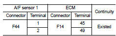 4. Check the continuity between A/F sensor 1 harness connector and ECM harness connector.