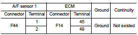 5. Check the continuity between A/F sensor 1 harness connector or ECM harness connector and ground.
