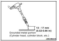 10. Fix ignition coil using a rope etc. with gap of 13 - 17 mm (0.52 - 0.66 in) between the edge of the spark plug and grounded metal portion as shown in the figure.