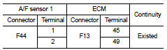 4. Check the continuity between A/F sensor 1 harness connector and ECM harness connector.