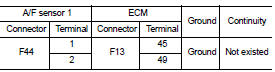 5. Check the continuity between A/F sensor 1 harness connector or ECM harness connector and ground.