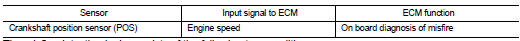 When a misfire occurs, engine speed will fluctuate. If the engine speed fluctuates enough to cause the crankshaft position (CKP) sensor (POS) signal to vary, ECM can determine that a misfire is occurring.