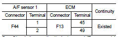 4. Check the continuity between A/F sensor 1 harness connector and ECM harness connector.