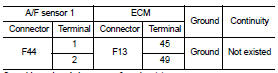 5. Check the continuity between A/F sensor 1 harness connector or ECM harness connector and ground.